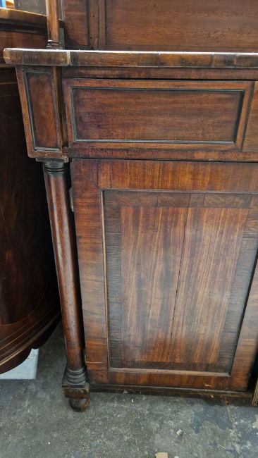 Surface scratches, scuffs and knocks. Areas of loss to the veneer. Crack to left cupboard door. Bottom hinge on right cupboard door has come away. General wear and tear. Floor to top of drawer - 82.5cm, front of cupboard to column support - 20.5cm, front of cupboard to front of shelf - 19.5cm