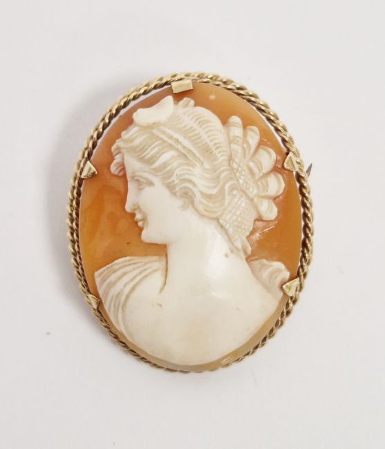 Modern 9ct gold shell cameo brooch, the oval cameo carved with a young lady within ropetwist border, approx 9.8g