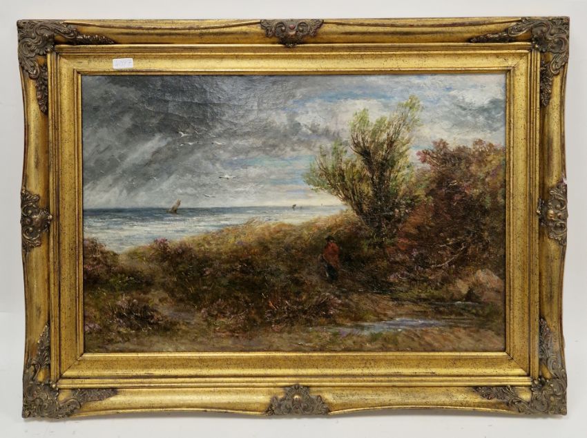 19th century English school Oil on canvas Stormy coastal scene with figure looking out to sea, unsigned, 51.5cm x 77cm