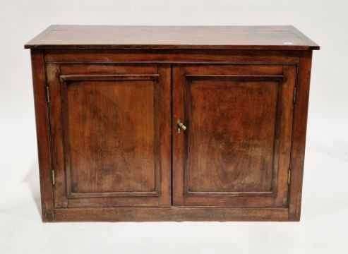 19th century mahogany cupboard, the rectangular top over two panel doors opening to two shelves, on plinth base, with key, 81cm high x 117cm long x 44cm deep