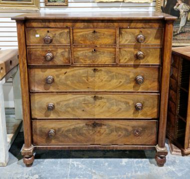 19th century flamed mahogany veneered chest of drawers comprising three short deep and three long cock-beaded drawers flanked either side by columns, on cup feet, 129cm high x 124cm wide x 59cm deep