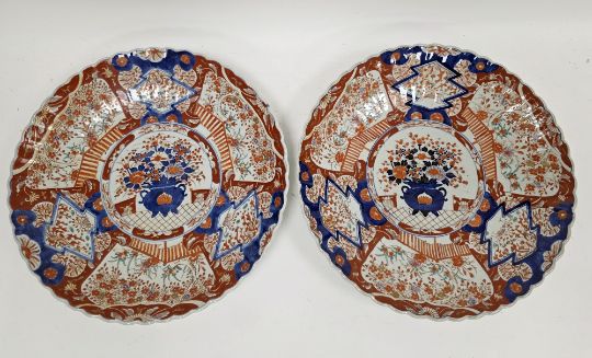 Pair of Japanese imari porcelain chargers, Meiji period, of scalloped form, each painted with a vase of flowers on a terrace to the centre, within shaped borders of flowering prunus and grasses reserved on an iron red ground, 47cm diameter (2)
