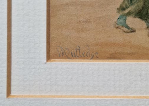 William Rutledge (Australian, 1924-1993) Pair watercolours Coastal scenes with fisherfolk on beach, signed, framed and glazed, mount aperture 8cm x 13cm and 7.5cm x 13cm, together with Mollie Forestier-Walker (1912-1990) Pastel on paper Portrait of Miss Katie Trievile, signed lower right, framed and glazed, image size 34.5cm x 24cm, bears 'The Portscatho Art Society' gallery label verso (3)