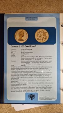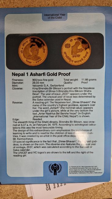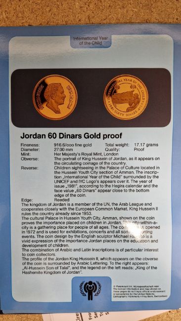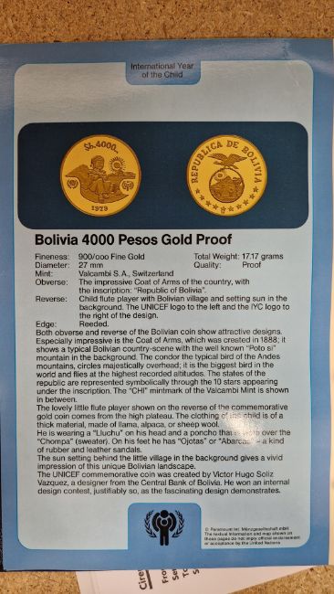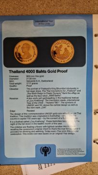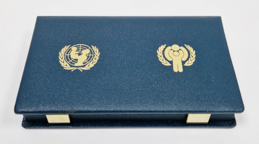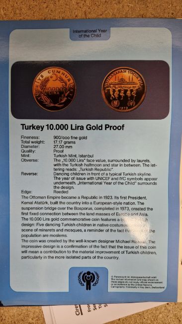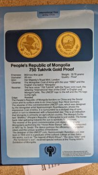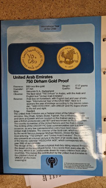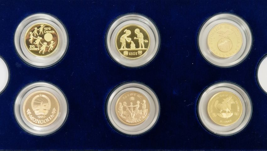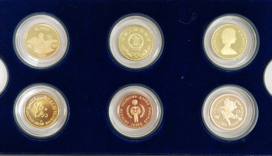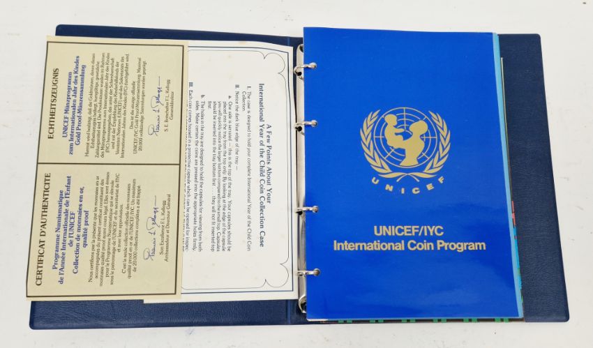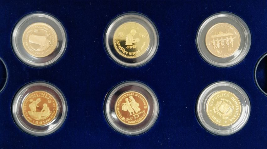 Set of twelve gold coins from the Unicef/IYC International Coin Program to commemorate the International Year of the Child, to include a Canada 100 Dollar gold proof, a China 450 Yuan gold proof, an Ethiopia 400 Burr gold proof, a UAE 750 Dirham gold proof, a Peoples Republic of Mongolia 750 Tukhrik gold proof, a Bolivia 4,000 Pesos gold proof, a Jordan 60 Dinars gold proof, a Nepal 1 Asharfi gold proof, a Turkey 10,000 Lira gold proof, a Thailand 4,000 Bahts gold proof, a Tunisia 75 Dina gold proof and a Dominican Republic 200 Peso gold proof, in fitted case with folder with information sheets and certificates Condition Report Total weight approximately 200gSee additional photos of certificates for weights/carats etc.