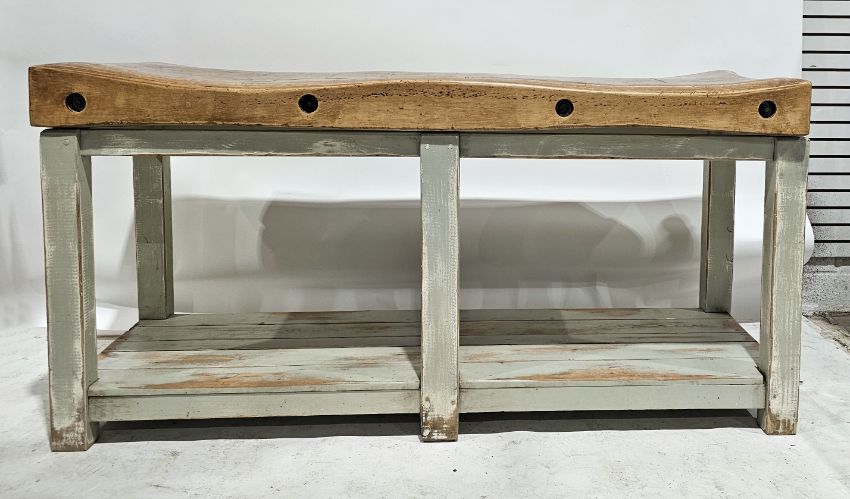 Early to mid-20th century large double length butcher's block with iron screw thread braces, on a distressed painted pine base with square supports and undershelf, 91cm high x 182cm long x 61cm wide