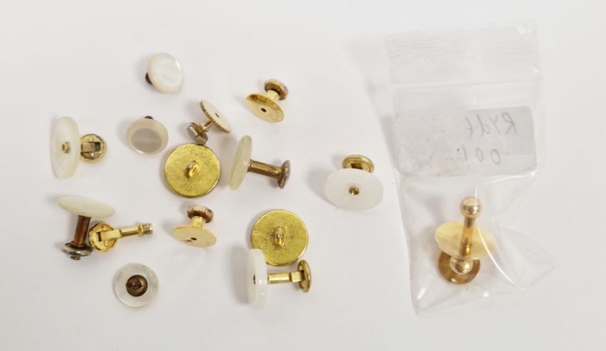 Two 10ct gold studs, approx total weight 3.7g, and other assorted gilt metal and mother-of-pearl studs