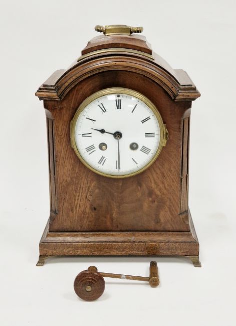 Early 20th century mahogany cased mantel clock, the domed top with brass loop carrying handle, the circular white enamel dial with Roman numerals and two winding holes, blind fretwork panels to sides, on four brass swept bracket feet, with winding handle, 31cm high
