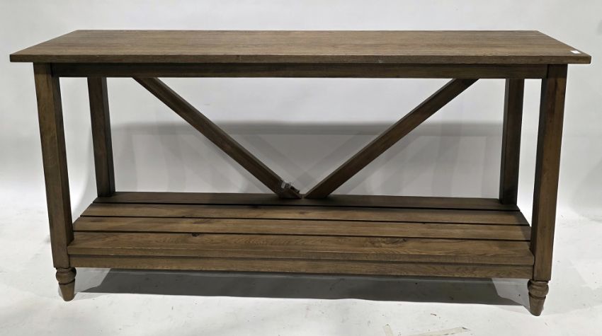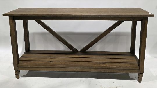 Modern oak console table, the rectangular top on square legs united by a slatted under-shelf, 80cm high x 160cm long x43cm deep