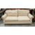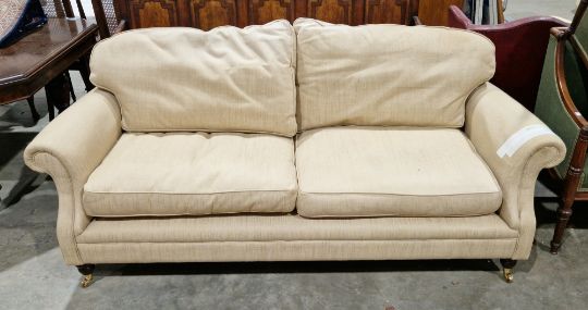 Modern cream upholstered three seater sofa, with scroll arms, on turned tapering front legs with brass caps and castors, 93cm high x 214cm long x 94cm deep