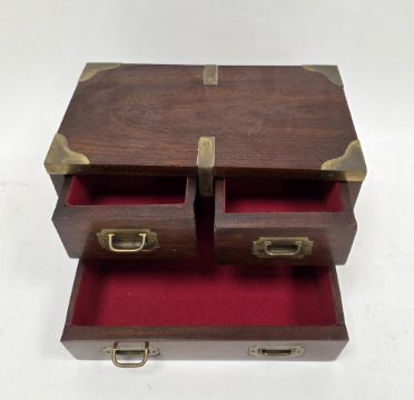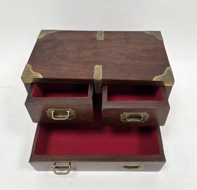 Mahogany and brass bound table top cabinet in the 19th century campaign style, comprising three drawers with brass recessed handles and drop loop handles to sides, 15cm high x 26cm long x 15cm deep