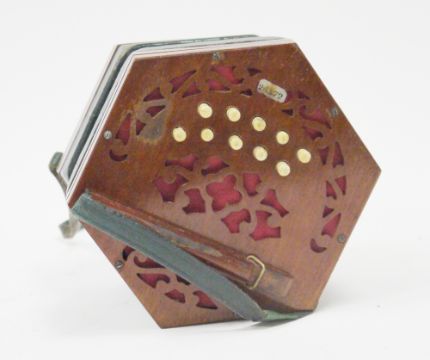 Metzler & Co of London concertina, no. 26372,  having twenty-one bone buttons on pierced mahogany ends and five fold bellows, 16cm wide, cased (PLEASE NOTE VAT WILL BE PAYABLE ON THE HAMMER)