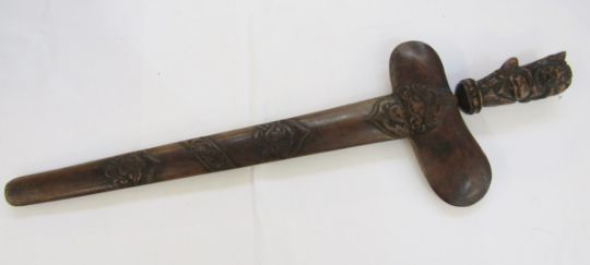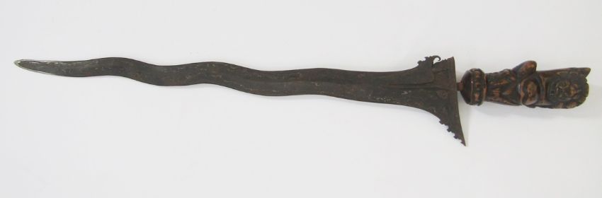 Javanese kris with carved handle, decorative blade and carved scabbard, together with a blowpipe and darts.