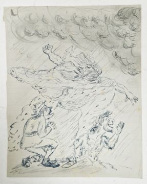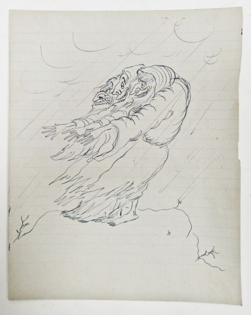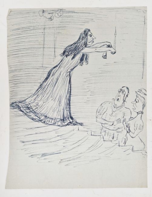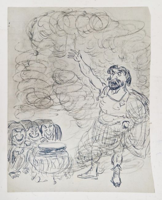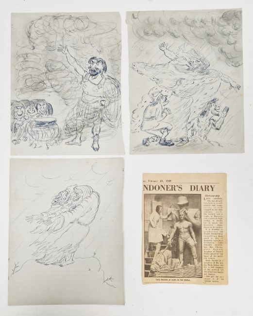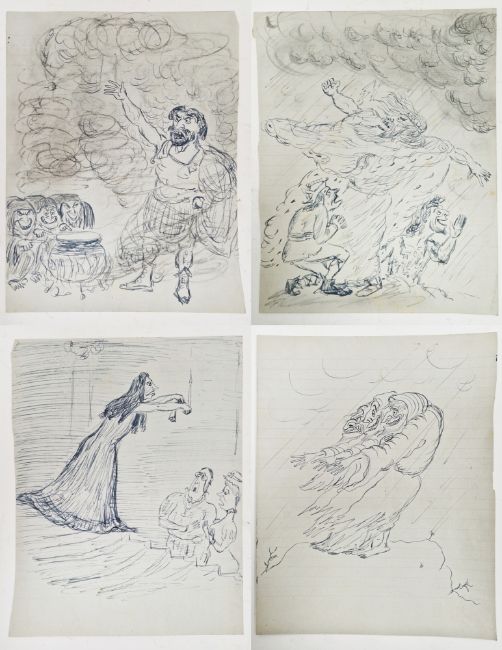 Angela Countess Antrim (1911-1984) Pen and ink Four sketches/designs on lined notebook paper, one possibly for Macbeth, unsigned, unframed, 25cm x 20cm (4)