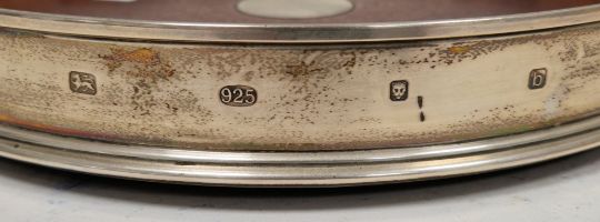 Large silver and mahogany bottle coaster, probably for a Solomon size bottle, London 2001, M C Hersey & Son Ltd, 26cm diameter