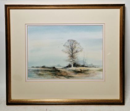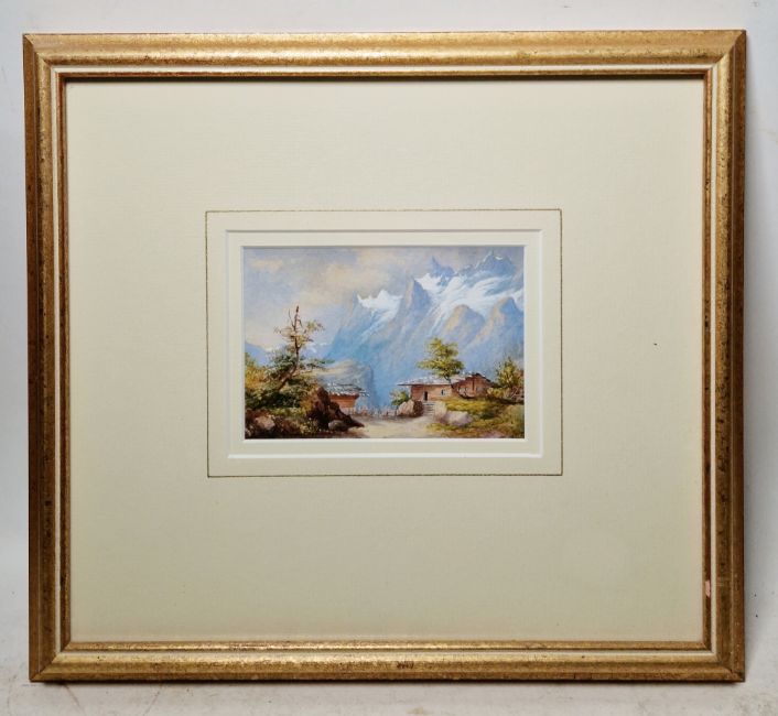 "At the Ploughing Match", ploughman and horse-drawn plough, signed and dated '91 lower left, inscribed and dated 1991 and with Burford Gallery label verso, framed and glazed, mount aperture 17cm x 23.5cm, together with a 19th century watercolour depicting an Alpine landscape with dwellings, unsigned, Wren Gallery label verso, framed and glazed, mount aperture 8.5cm x 12.5cm, a Gordon Dale watercolour "Cheshire Farm Track", signed and dated '92 lower left, artist label verso, framed and glazed, mount aperture 19cm x 27cm and two pastel landscapes by M.M. Tomlinson (5)