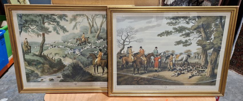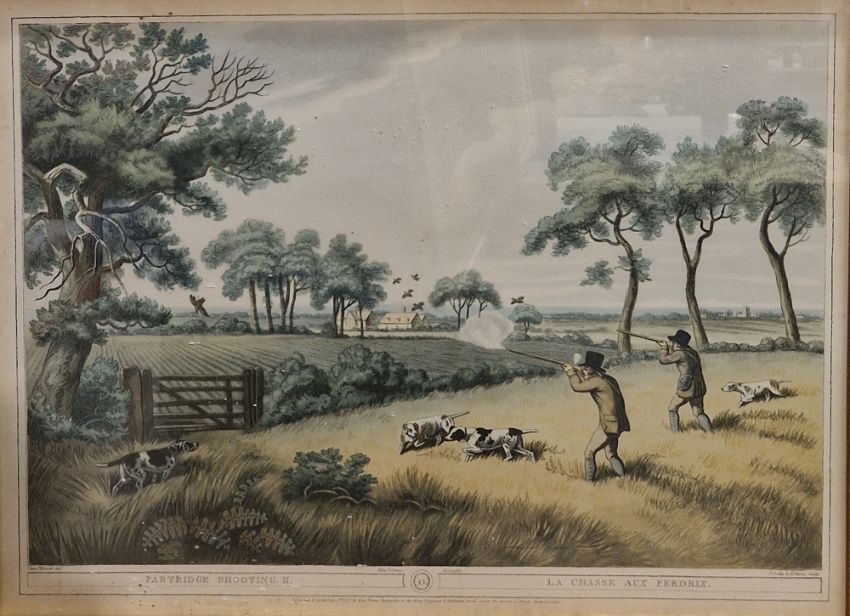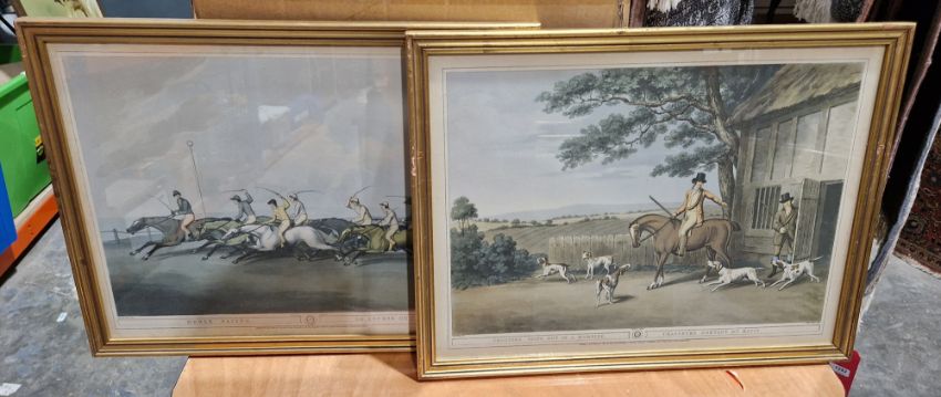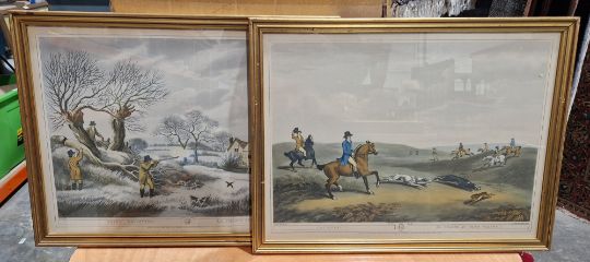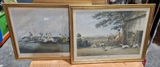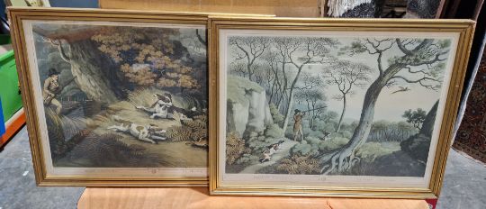 Nine framed hunting prints after Samuel Howett, with engraved after J.Godby and H Merke, 20th century, including grouse shooting, hare hunting, snipe shooting and coursing, etc, two framed mirrors and a lacquered print triptych