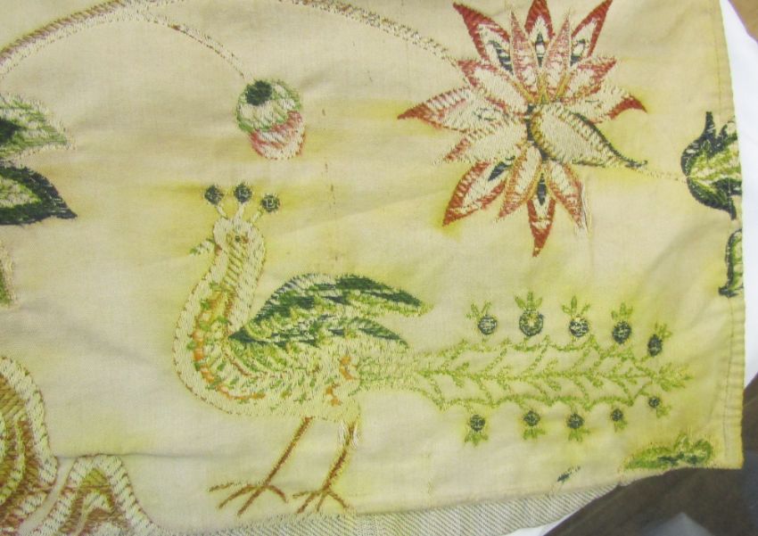 A large single door curtain, vintage damask, embroidered with birds, floral decorations, 185cm long x 120cm wide approx