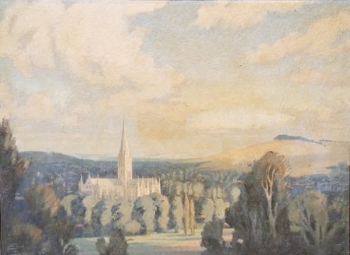 Enid Brown Oil on board View of Salisbury Cathedral, signed and dated 52, 51.5cm x 70cm  Condition Report There are some brown/black spots on the picture (see additional catalogue photos). There is some yellowing to the picture - it needs a good clean.