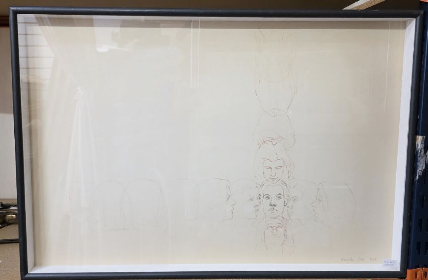 Kenelm Cox (1927-1968)  Rotating Heads, circa 1966/67, signed in pencil and dated 1968, in original frame made by the artist together with poster designed by Cox for his one man show at Arlington Mill 1967, 52cm x 78cm