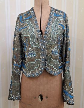 Right hand sleeve has a few caught threads and missing sequins. The seam is pulled. Seam to right hand armpit and back sleeve pulled. Seam to left hand sleeve pulled. Loss of turquoise sequins throughout. Left hand sleeve has some caught threads. The metallic material of the jacket has some discolouration throughout.