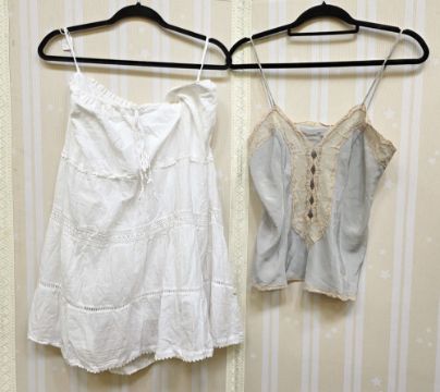 Vintage camisole, a white cotton crochet trimmed petticoat, a mid-century yellow satin nightgown and a pair of Chinese-style silk pyjamas (4)
