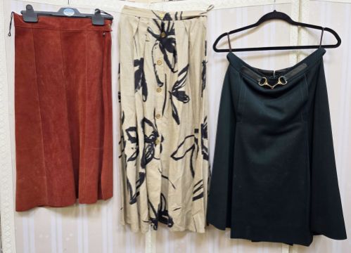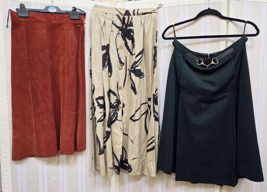 1970's maxi skirt by Peggy Page, purple velvet with gilt buttons all way down the front, a gold knitted maxi skirt, a Laura Ashley black velvet and ribbon full-length skirt labelled size 10, a rust-coloured suede A-line skirt, a Max Mara linen printed black on beige full skirt and a Celine twill wool skirt in bottle green, single box pleat, with snaffle bit detail to the fixed belt (6)