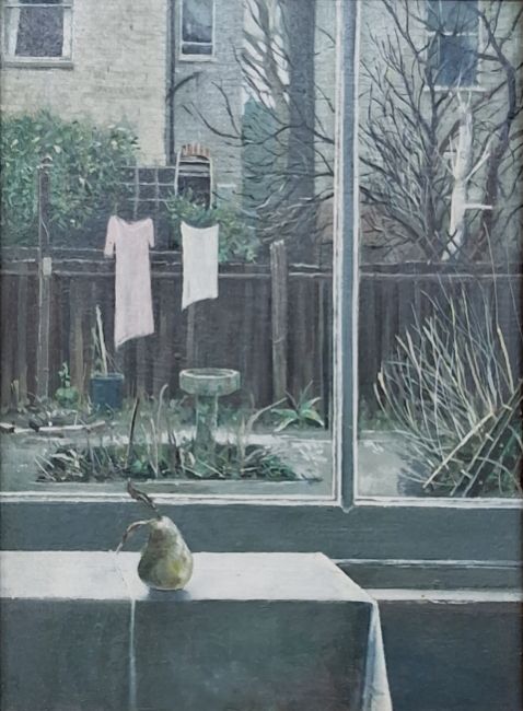 Paul Jackson  Oil on board "Back Garden", view through window to washing line and backs of houses, with pear on table in foreground, labelled verso, 28.5cm x 20.5cm