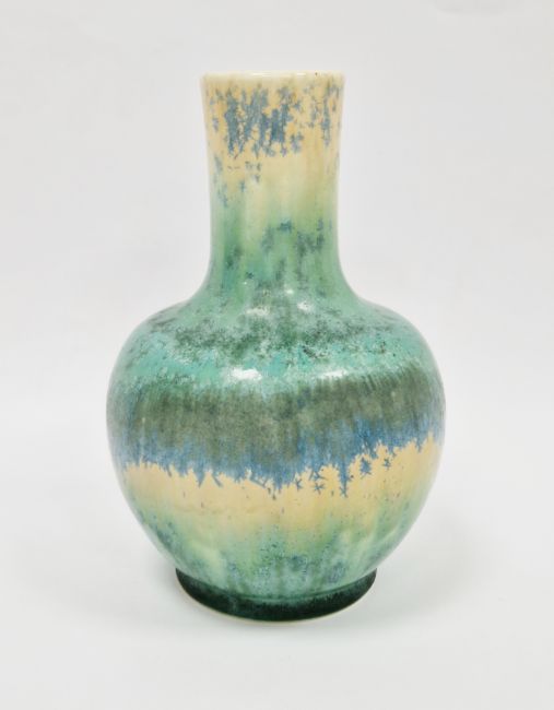 A Ruskin crystalline glazed vase, mottled blue and green over yellow ground, impressed marks and dated 1932 to base, 18cm high