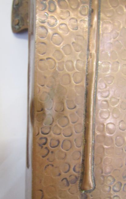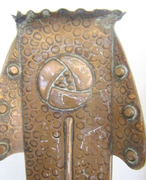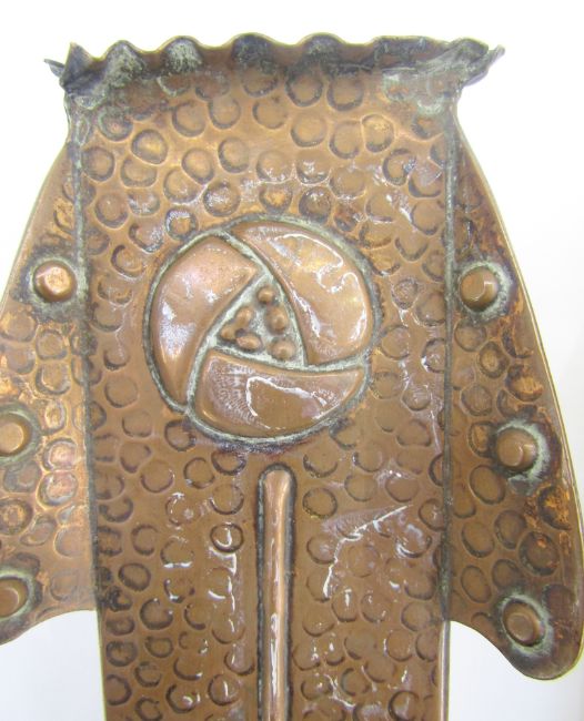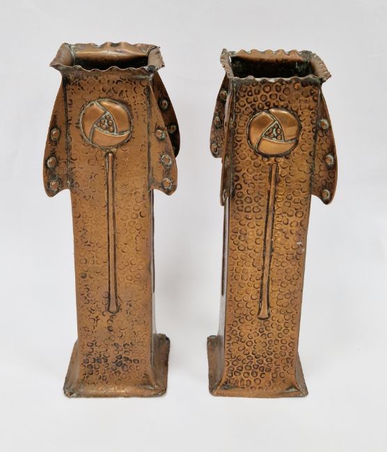 In the manner of J&F Pool Hayle Cornwall, a pair of Arts and Crafts copper vases in the secessionist manner, with art nouveau floral pattern and wings to each corner, 22cm high (2)