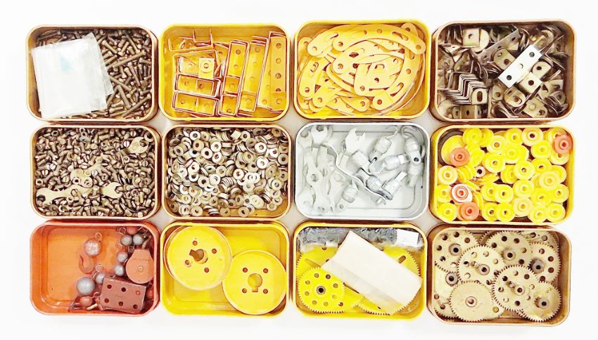 Quantity of Meccano parts in tins to include gear wheels, flexible plates, triangle plates, bolts, washers, curved strips, Meccano No.6 tin, Meccano No.8a box with four loaded sacks, braced girders, double angle strips, spanners, etc (4 boxes)