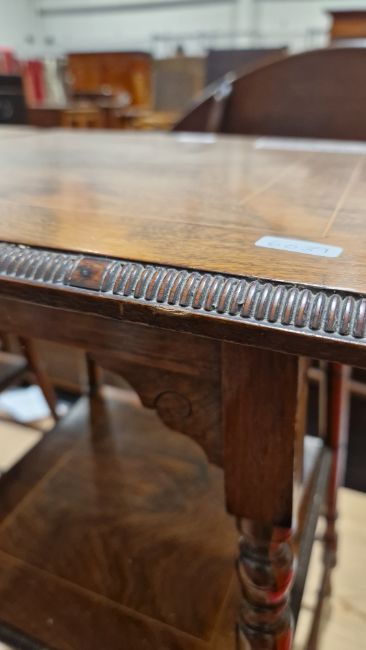 Pair of 19th century rosewood aesthetic movement side tables, of square tapered form, the tops and undershelves with gadrooned carved edges, on turned and ringed spindles legs and side-stretchers, 64cm high x 41cm wide (one table with a/f spindle)