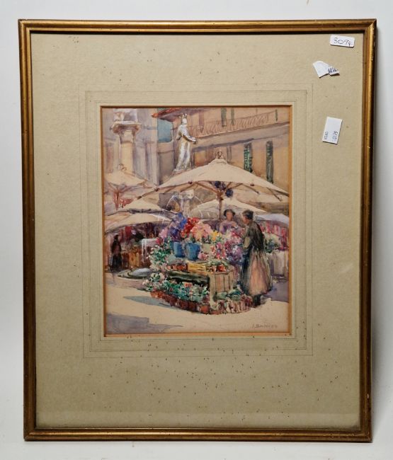 I Barnes (circa 1928) Watercolour drawing "Verona Market", signed and labelled verso with date 1948, 24cm x 20cm