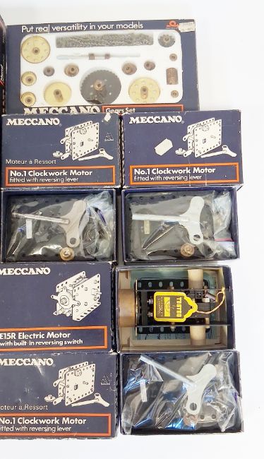 Meccano boxed motors and accessories to include two E15R Electric Motors, 11175 Hand Generator, two No.11000 Magic Clockwork Motors, three No.1 Clockwork Motors, Gears Set and a Battery Control Box