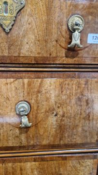 Surface scratches, scuffs and knocks, fading/discolouration and some stains. Some splits to the veneer. Split to top and right side. Handles appear to have been replaced. Feet look original. General wear and tear.