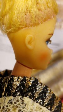 The metallic clothes do not feel sticky. Small green spot near temple of one doll. No splits to necks