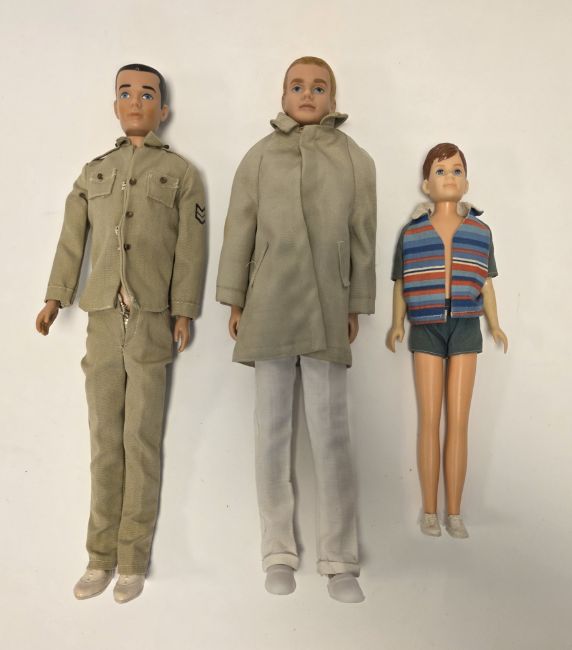 Mattel Barbie Ken doll with blonde flop hair and blue eyes, dressed in a rally outfit, marked Ken Mattel to buttocks, another Mattel Barbie Ken doll with moulded brown hair and blue eyes, dressed in an army outfit, marked 1960 Mattel to buttocks and a Mattel Skipper's Friend Ricky doll with moulded auburn hair, in a striped shirt and shorts set, stamped Mattel 1963 to buttocks (3)
