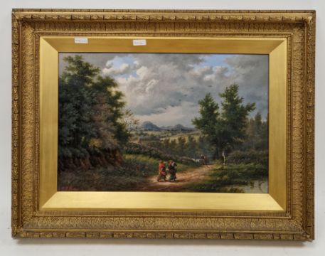 A. G/E. Evans (19th century) Oil on canvas Travellers in wooded river landscape, signed lower left, 41cm x 61 cm