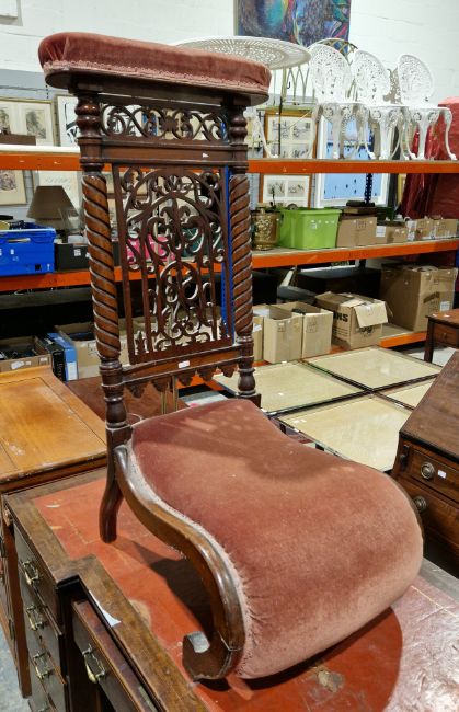 Late 19th / early 20th century mahogany and satinwood inlaid twin pedestal desk of inverted breakfront form, the top with red leather inlaid writing surface over an arrangement of nine drawers with brass drop loop handles and shaped back[;ayes, on bracket feet with castors, 78cm high x 137cm wide x 67.5cm deep together with Victorian mahogany prie-dieu chair with fretwork carved back, 99cm high x 42cm wide x 60cm deep (2)