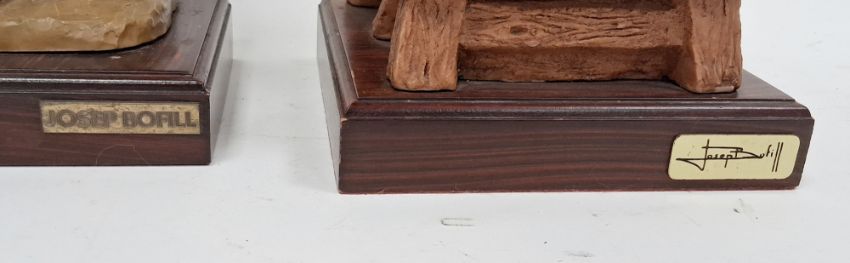 After Josep Bofill, two resin figures, the first of a walking girl wearing a shawl, the second a nativity scene, both on square rosewood effect plinths with name plaques, 31cm high