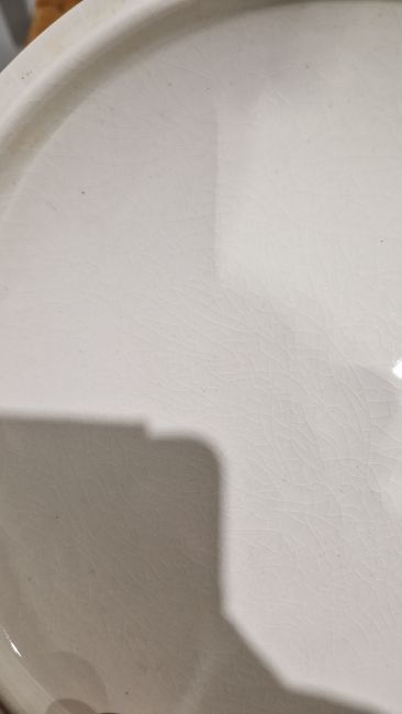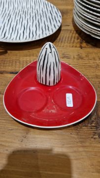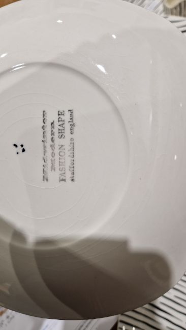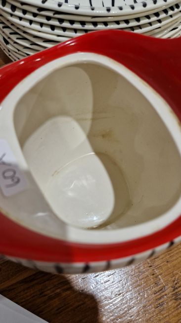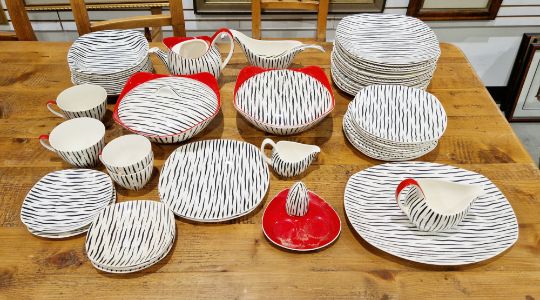 Extensive 1950s Midwinter Stylecraft 'Zambesi' pattern part dinner service, comprising two tureens and covers, seventeen dinner plates, fifteen side plates (varios sizes), gravy boat and ladle, part cruet set, creamer, milk jug, teapot (missing lid), four cups and saucers, twelve bowls, platter (58) Condition Report All items with typical wear and tear and signs of use.Dinner plates - 5 with chips, 2 with crazing, 1 with star crackSide plates - 2 with chip, 4 with crazingMilk jug - Crazing and staining to interiorSaucers - 1 with chip, 1 with corner broken off but presentBowls  - 3 with crazing, 1 with star crack, 2 with chipsTeapot - Missing lid, staining to interiorTureens - 1 with crack near rim, crazing and staining, the other with crazing to underside of lidGravy boat - Ladle with crazing and stainingCondiment set - 2 items missing