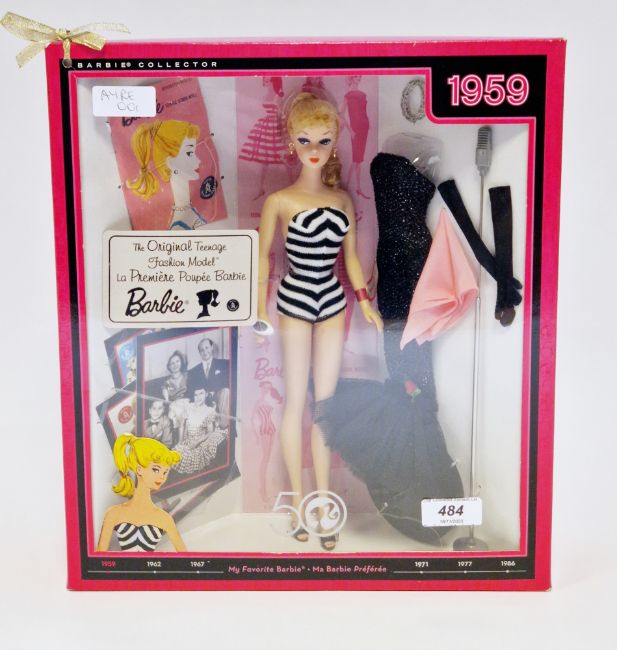 Barbie 50th Anniversary My Favourite Barbie collection 1959 with black and white swimsuit, evening gown and accessories, boxed