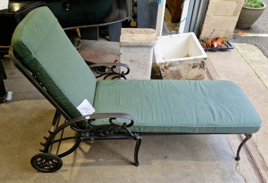 Aluminium framed garden lounger with green upholstered seat and back rest