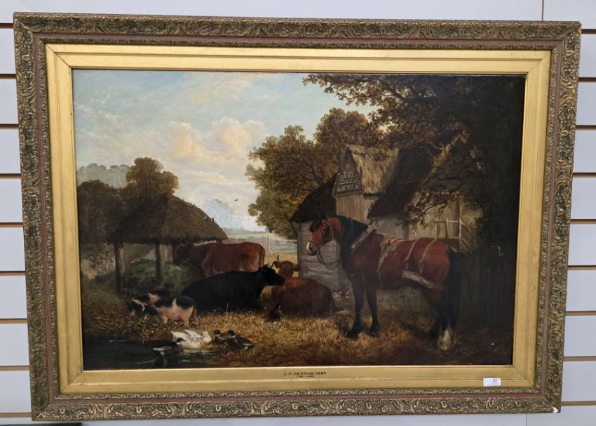 After J F Herring (Snr)  Oil on canvas Farmyard scene with horse, cattle, pigs and ducks in foreground, 60cm x 89cm
