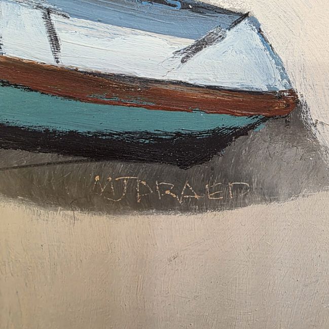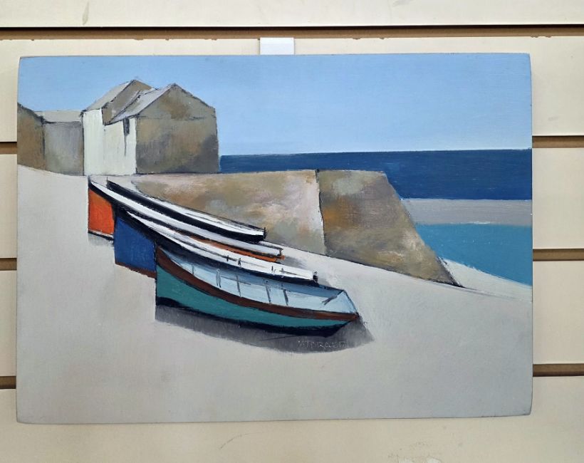M. J .Praed (British b. 1941) Oil on board Boats resting in boatyard, building in the background, signed M J Praed centre, 29.5cm x 42cms, unframed Condition Report There are no condition issues to report with this picture.