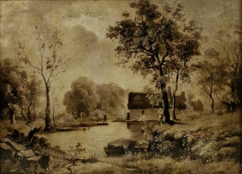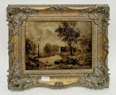 James Stark (1794-1859) Oil on panel River scene with figure on a punt, dwelling beyond, signed lower right, image size 21.5cm x 29.5cm