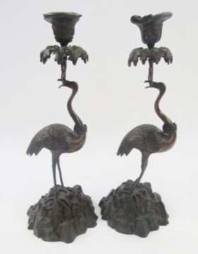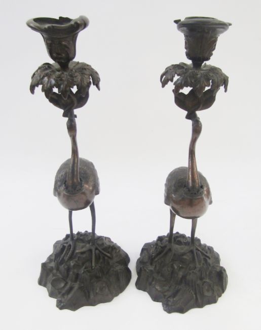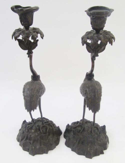 After Thomas Abbot pair bronze crane candlesticks, each with scroll decorated sconce, foliate drip tray with crane column standing on raised rocky base, 39cm high