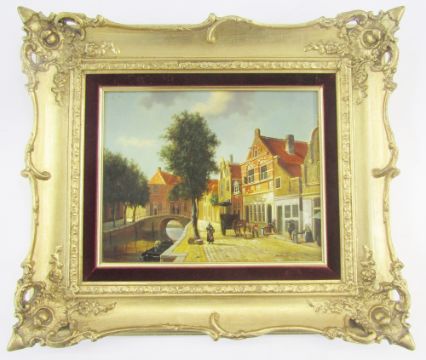 H Veger (b.193??)  Oil on board "Enkhuisen", canalside buildings with figures, horse and cart, signed lower left, 19cm x 24cm
