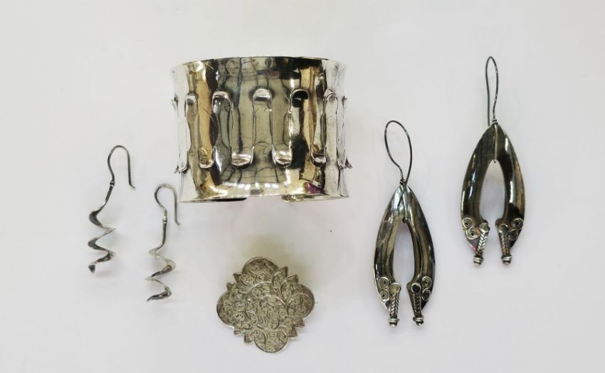 Collection of white metal jewellery including a torque bangle of modernist design, a brooch with foliate scroll engraving, a pair of spiral twist drop earrings and another pair of drop earrings, approx total weight 74g