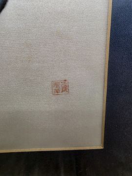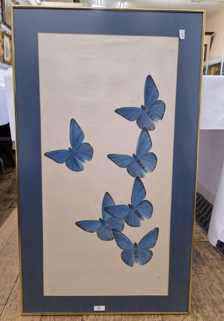 Oriental colour print, blue butterflies with red stamp, 81cm x 40cm