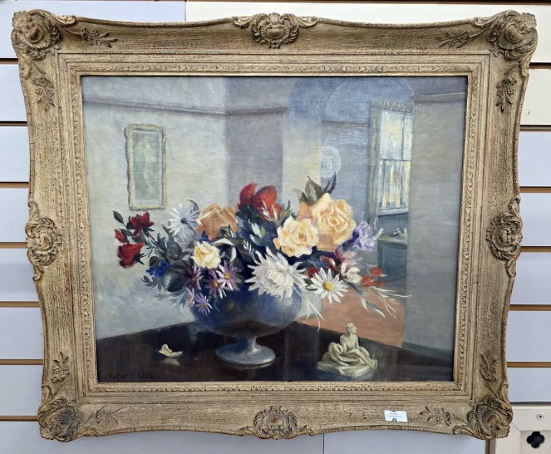 Victor F Webb Oil on canvas Still life flowers in vase, inscribed verso 'Interior with Flowers by Victor F Webb 1954, Glenmore Lodge, Wellington Square, Cheltenham', 49cm x 59cm